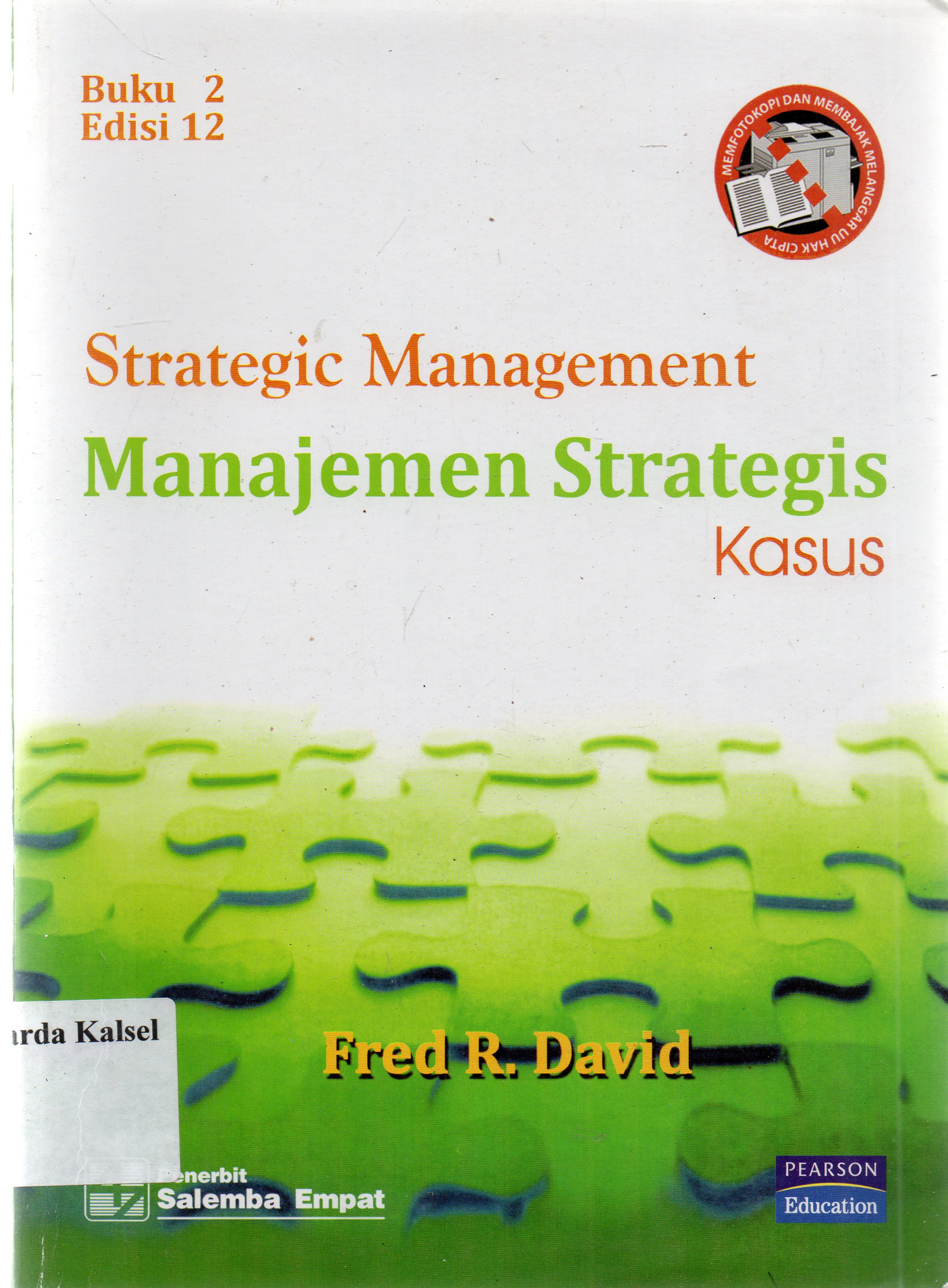 | Judul | Strategic management : manajemen strategis kasus / Fred R. David ; penerjemah, Diana Angelica ; editor, Papuli Wuriarti, Deressi Opip. |