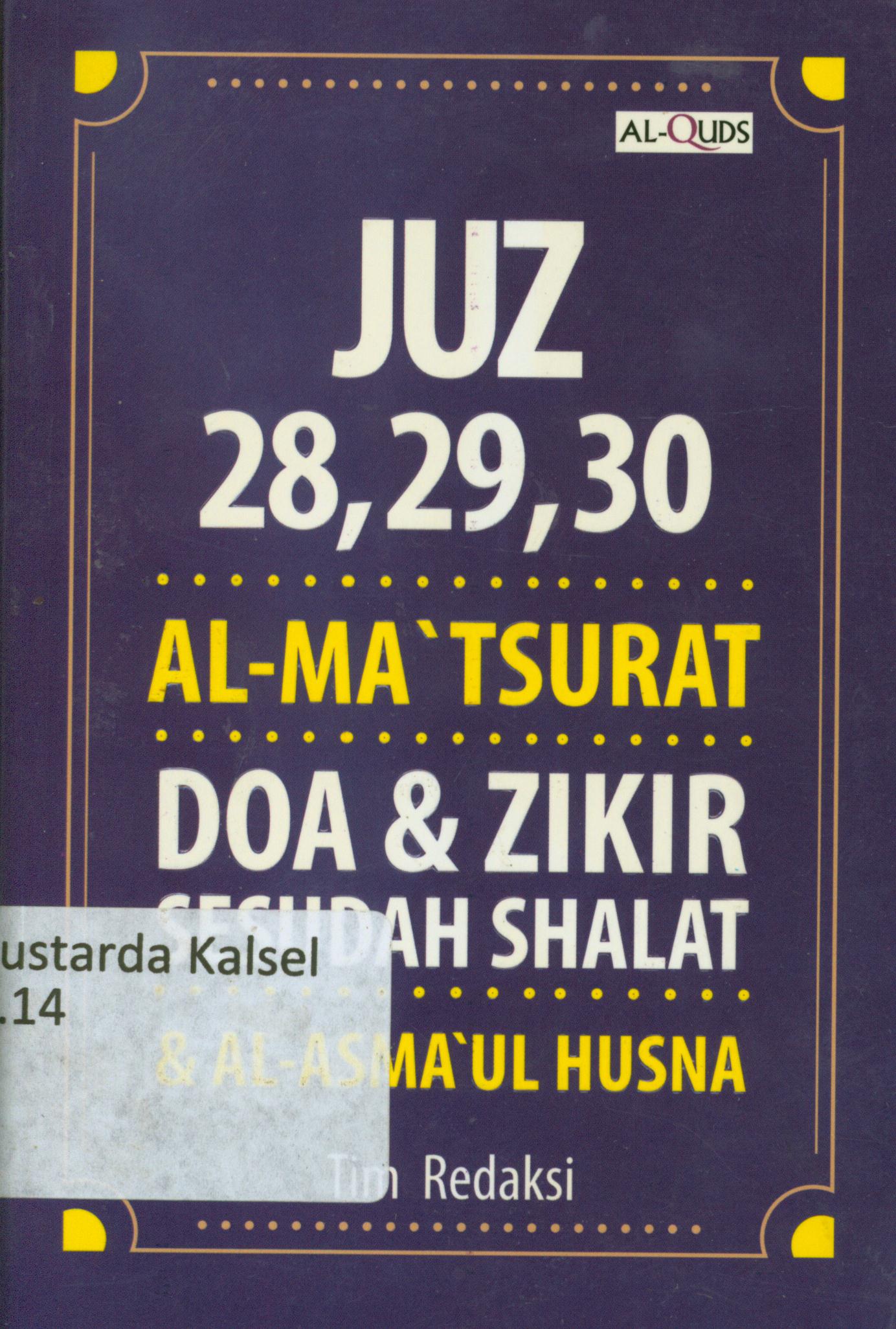 | Judul | Juz 28, 29, 30 Al-ma'tsurat Doa dan zikir sesudah shalat dan Al-Asma Ul Husna / editor, Endang Maryuni, Erlina Z.Zachi, Syaiful Mujahidin Hamzah |