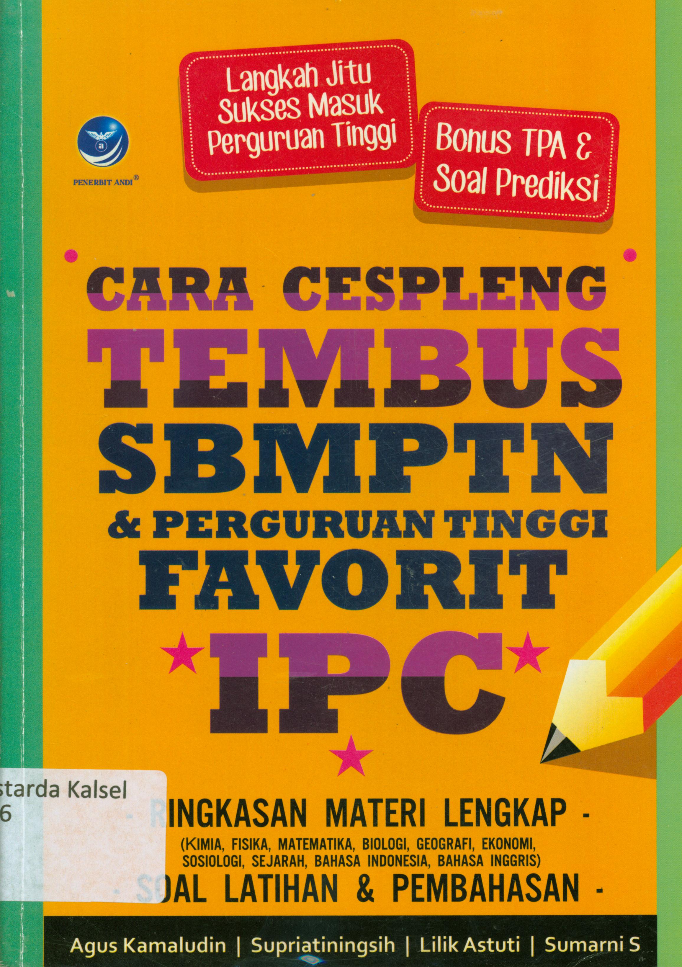 | Judul | Cara cespleng tembus SBMPTN dan perguruan tinggi favorit IPC : langkah jitu sukses masuk Perguruan Tinggi bonus TPA dan soal prediksi / Agus Kamaludin...[et.al.] ; editor, Benedicta Rini W |