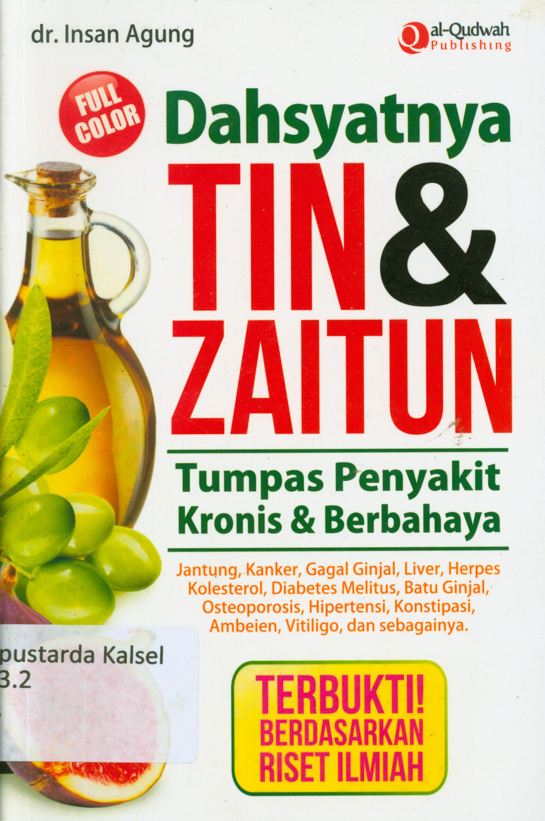 | Judul | Dahsyatnya tin dan zaitun : Tumpas penyakit kronis dan berbahaya : Jantung, kanker, gagal ginjal, liver, herpes, kolesterol, diabetes melitus, batu ginjal, osteoporosis, hipertensi, konstipasi, ambeien, vitiligo dan sebagainya / Insan Agung ; penyunting, Endang R |