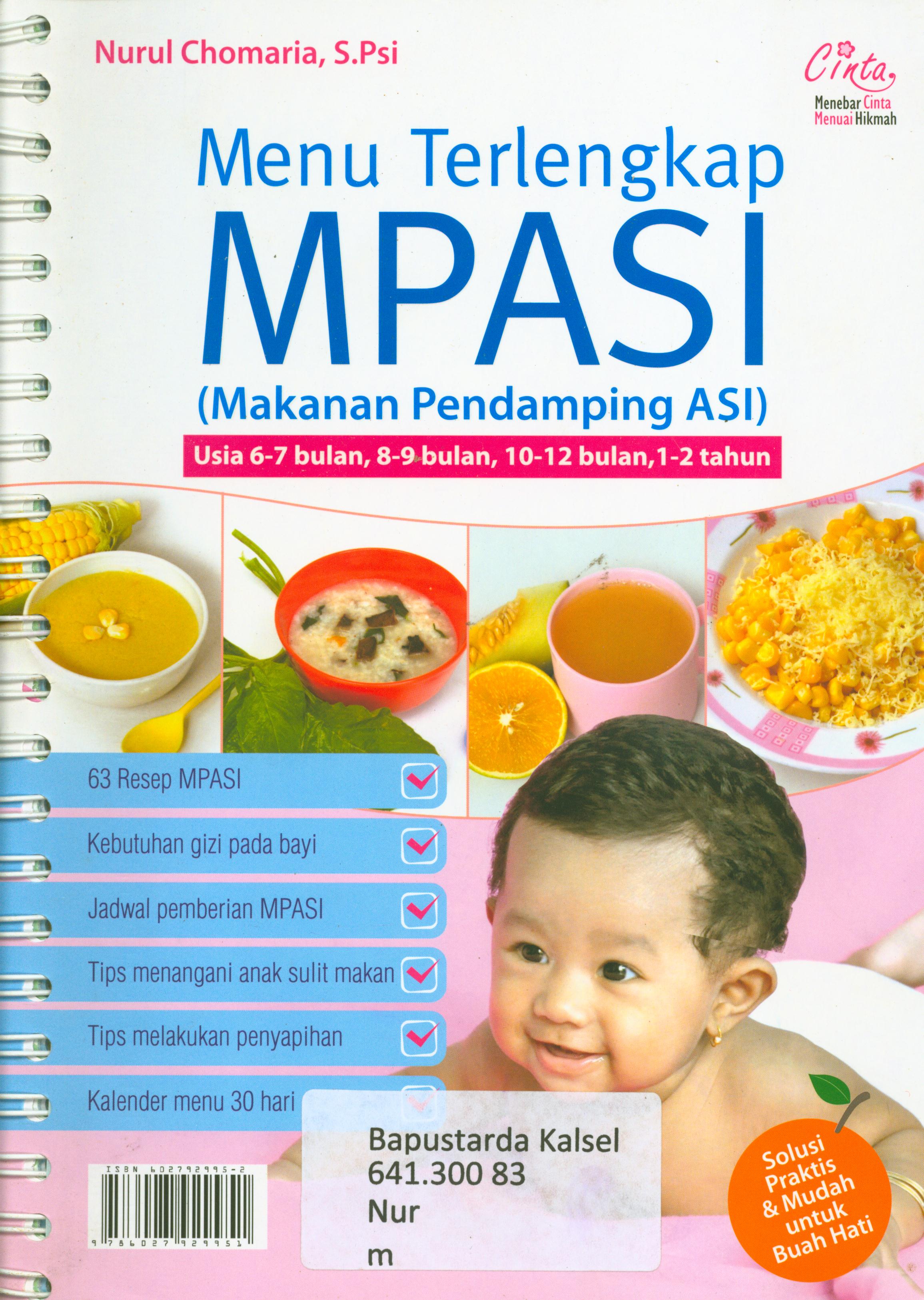 | Judul | Menu terlengkap MPASI (makanan Pendamping Asi) usia 6-7 bulan, 8-9 bulan, 10-12 bulan, 1-2 tahun / Nurul Chomaria ; penyunting, M. Lukman Hakiem |