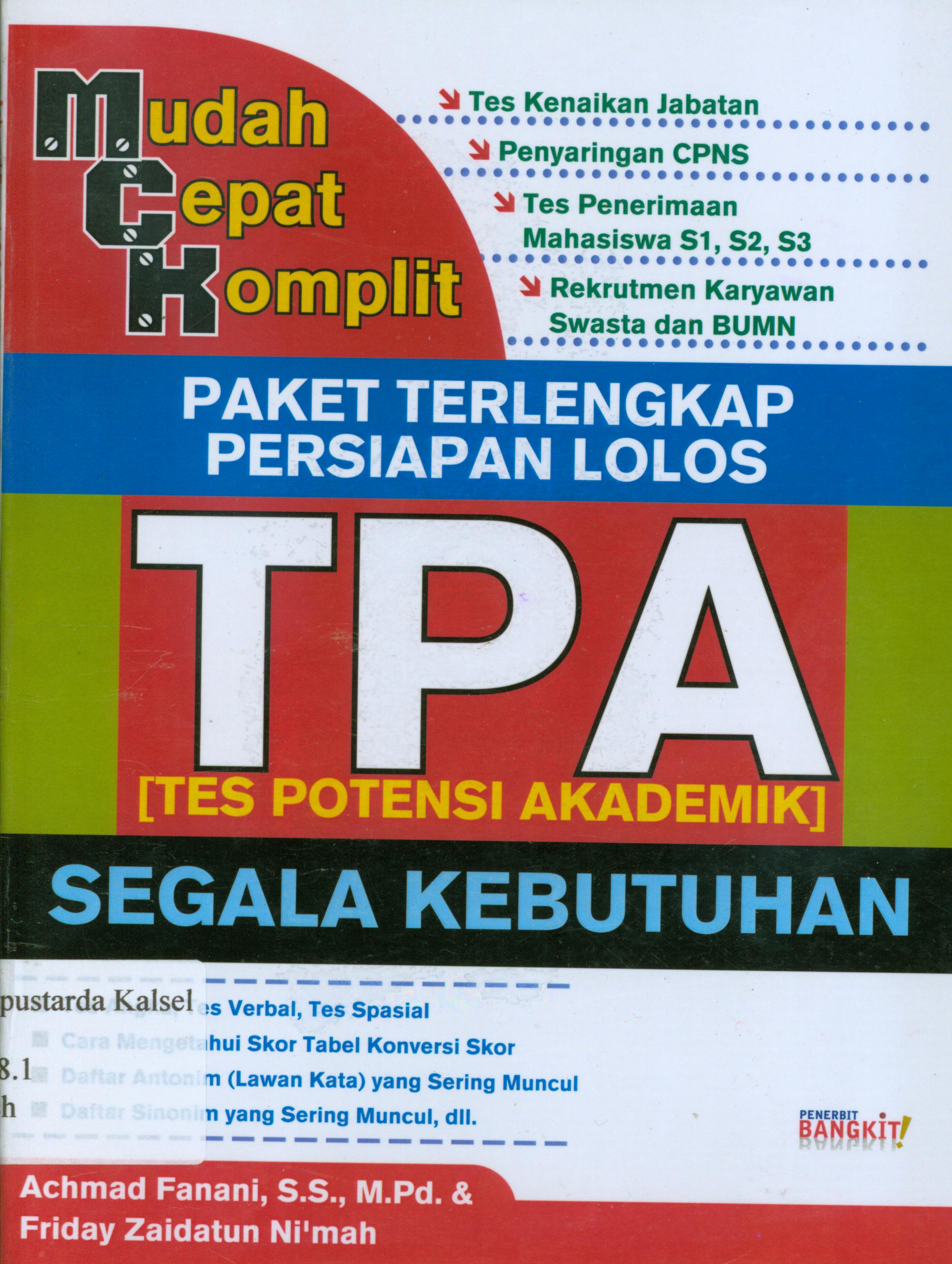 | Judul | Paket terlengkap persiapan lolos TPA ( Tes Potensi Akademik ) segala kebutuhan / Achmad Fanani, Friday Zaidatun Ni'mah ; penyunting, Daru Wijayanti. |