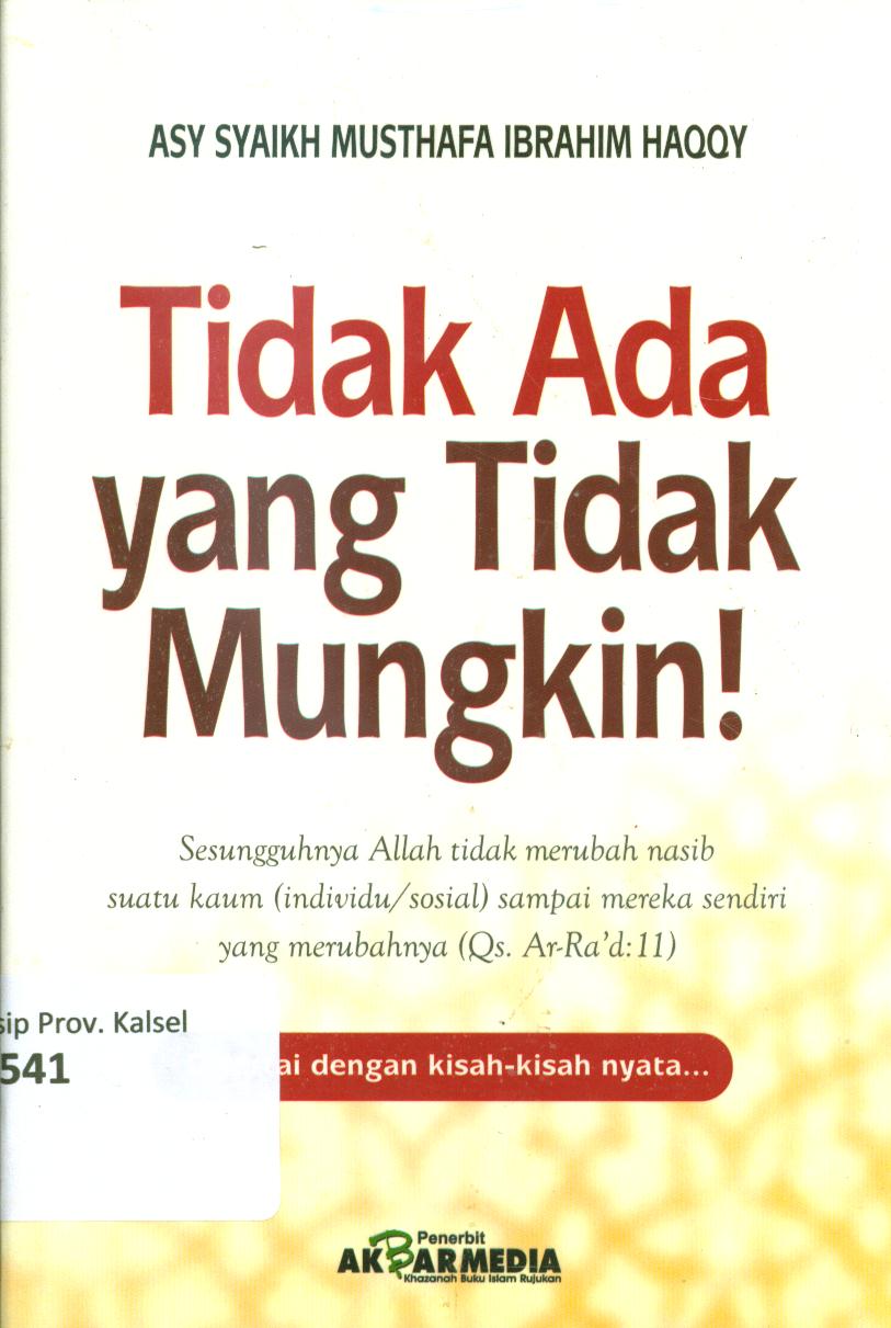 | Judul | Tidak ada yang tidak mungkin : Sesungguhnya Allah tidak merubah nasib suatu kaum (individu/sosial) sampai mereka sendiri yang merubahnya (QS. Ar-Ra'd: 11) / Asy-Syaikh Mushtafa Ibrahim Haqqy ; penerjemah, Hasan Barakuan, editor, Hirdan |