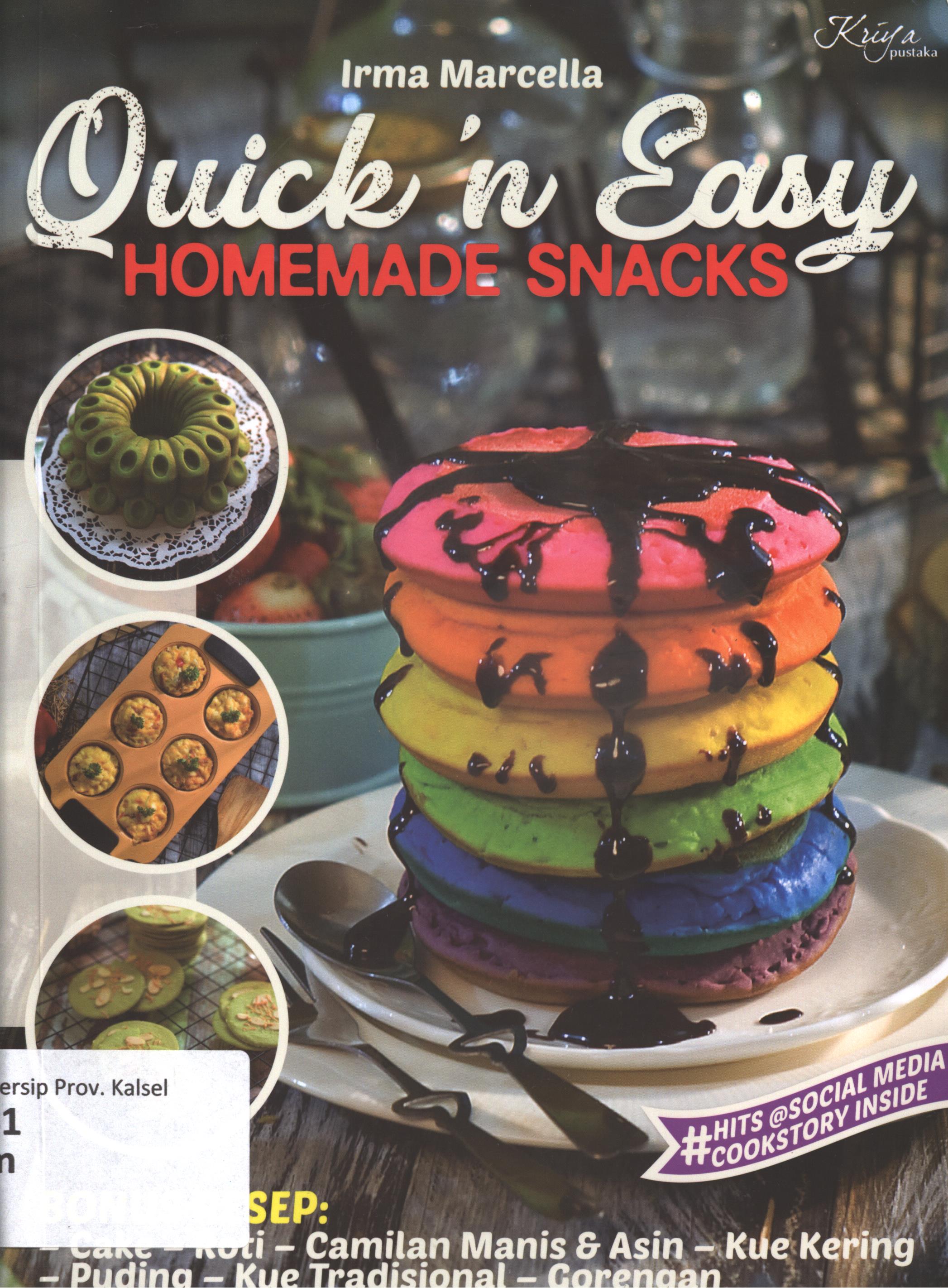 | Judul | Quick 'N easy homemade snacke / Irma Marcella ; penyunting, Zepthi, food stylish, Indriyadi Hastoro dan Zegha, piranti saji, irma Marcella,fotogrfer, Wisnu Yudowibowo, foto isi dan sampul, Dok. Kriya Pustaka, grup Puspa Swara, anggota IKAPI, perancang sampul, Zariyal, penata letak, Heru Tri Handoko |